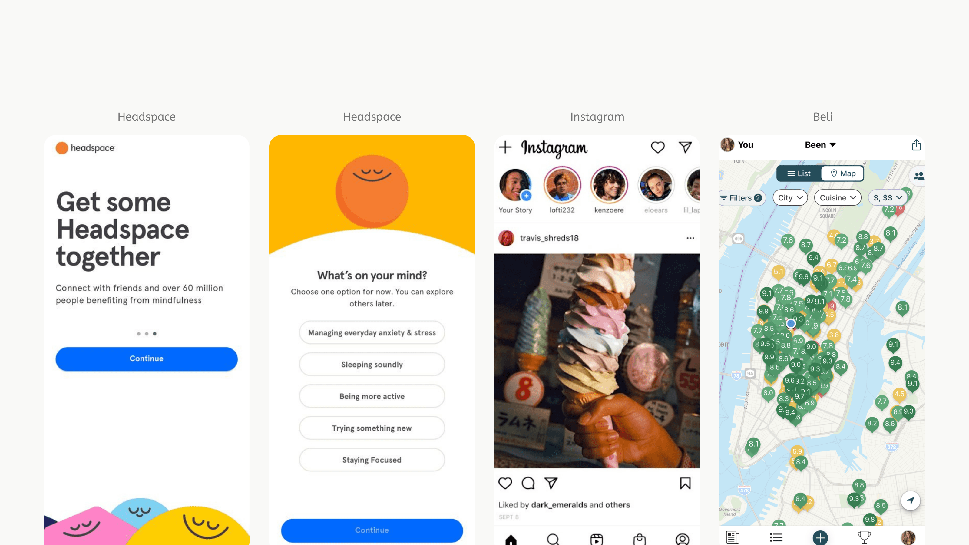 We explored design layouts of several other apps that focused on social engagement, community-building, or mental wellness. For each of these competitors, we noted several aspects: