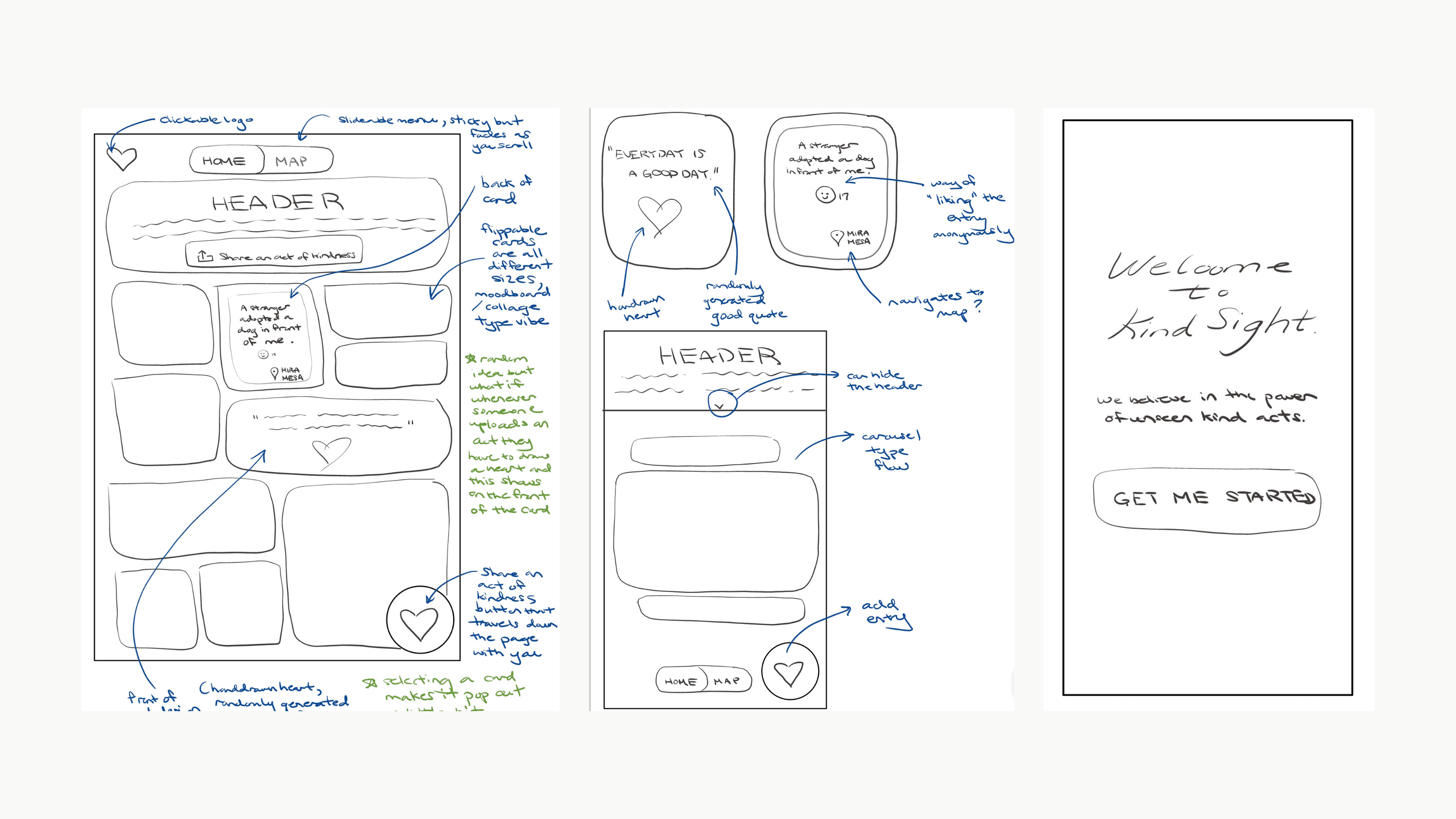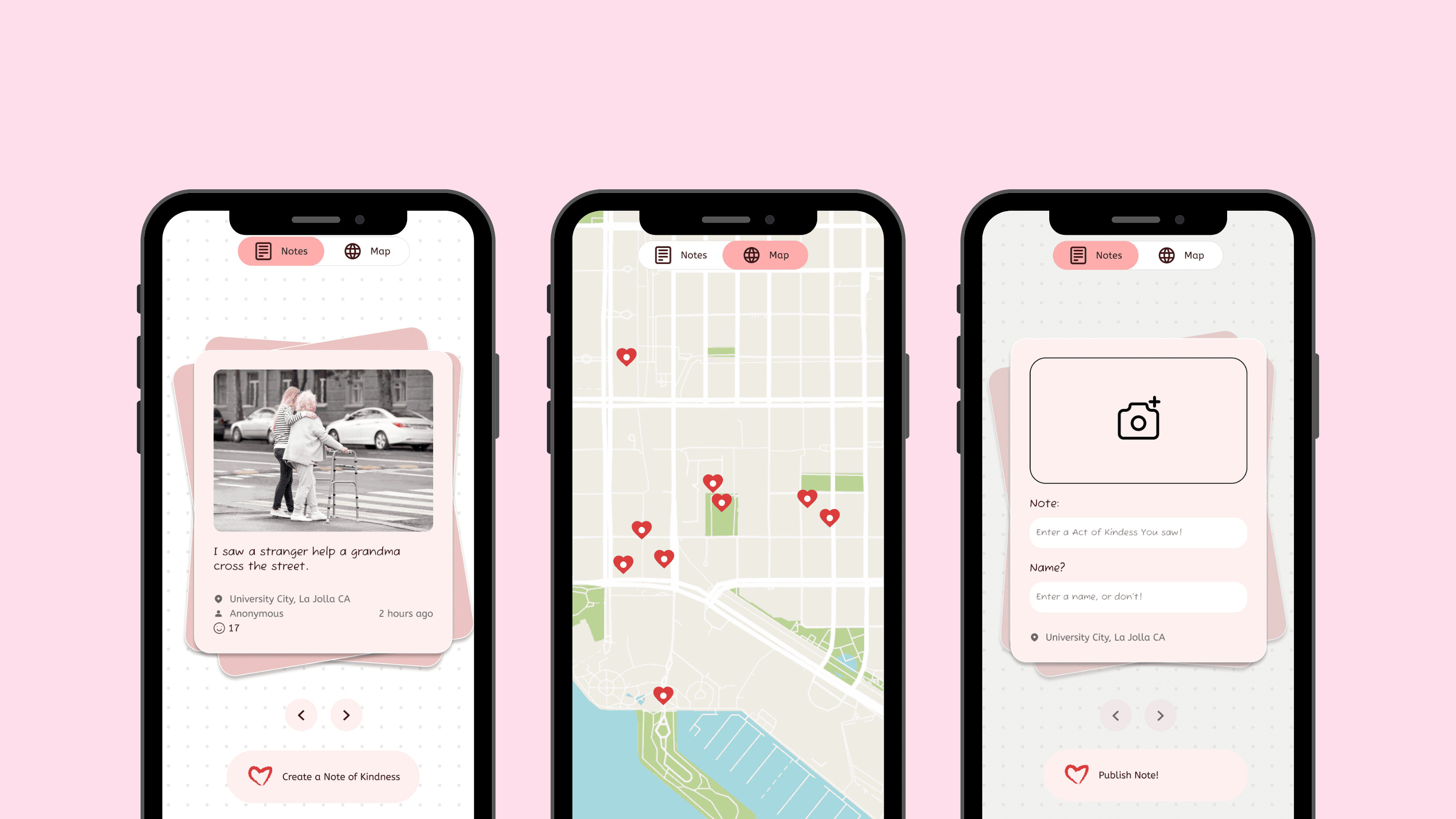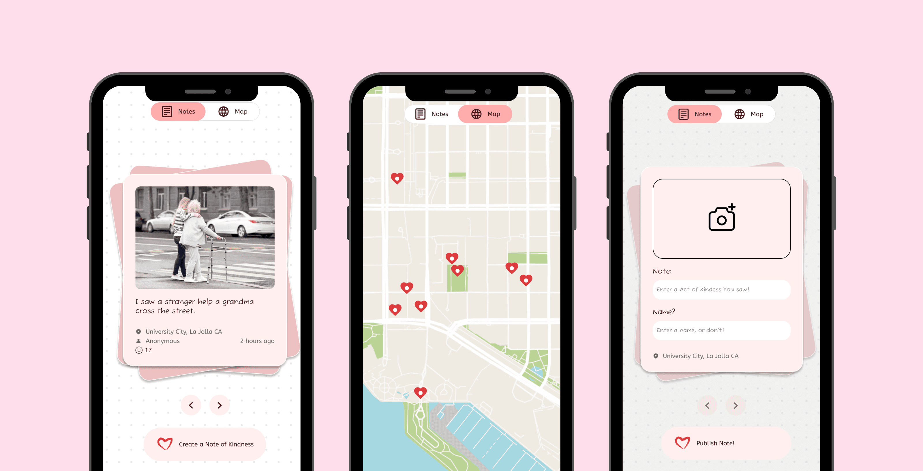 We designed KindSight, a location-based app that allows users in San Diego to share and discover real acts of kindness happening around them. The app promotes emotional well-being through a feed centered on positive, community-driven content.
