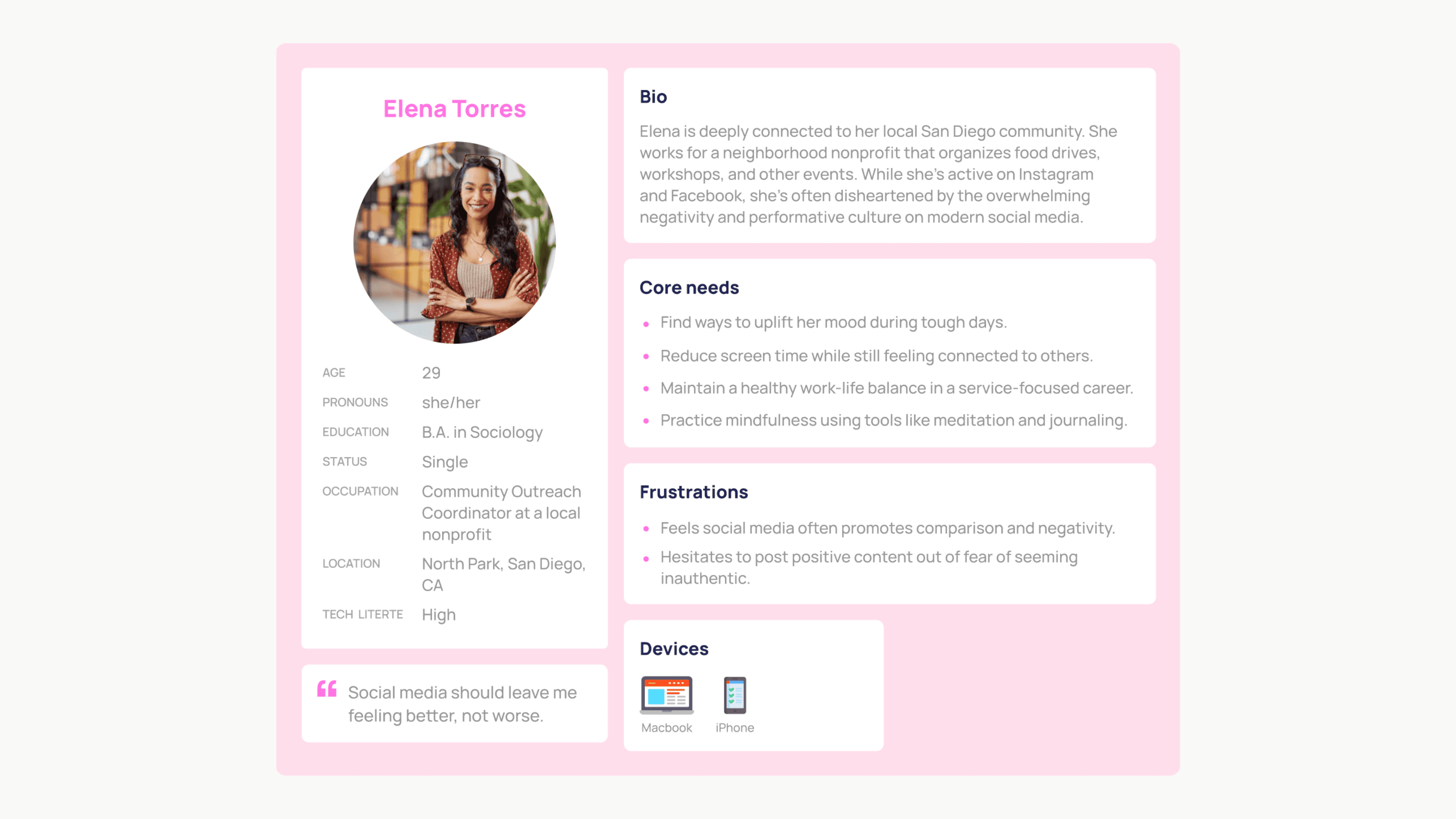 After brainstorming using FigJam, we decided to focus our problem space on emotional well-being in the modern age. In particular, we explored how this may be negatively impacted by modern social media, especially in the local San Diego area. To better understand the psychological and social effects of digital platforms, we conducted initial research using credible sources such as Pew Research and UC Riverside studies. We found that negative content on social media spreads 63% faster than positive content, leading to skewed worldviews and increased psychological distress. In contrast, studies from UC Riverside show that regularly witnessing or recording kind acts can significantly reduce symptoms of anxiety. Additional research highlighted how exposure to kindness increases the likelihood of paying it forward by up to 25%. These insights helped us identify a powerful yet underutilized opportunity: using digital media to amplify real-world positivity.